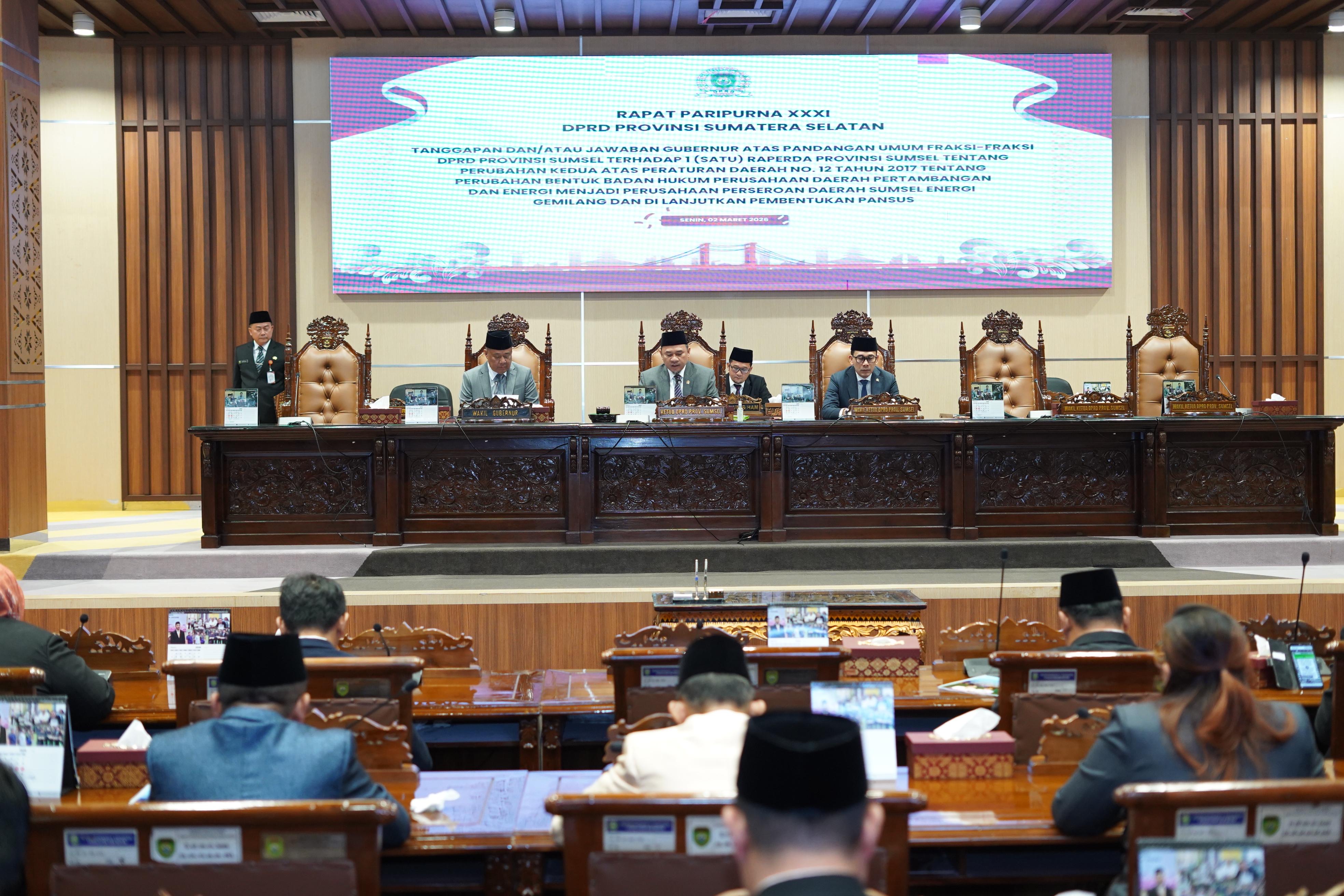 Raperda tersebut mengatur perubahan bentuk badan hukum Perusahaan Daerah Pertambangan dan Energi menjadi Perusahaan Perseroan Daerah Sumsel Energi Gemilang. Perubahan ini menjadi langkah strategis Pemerintah Provinsi Sumsel dalam memperkuat tata kelola perusahaan daerah agar semakin profesional, transparan, dan akuntabel, sekaligus adaptif terhadap tantangan dan dinamika sektor energi dan pertambangan.