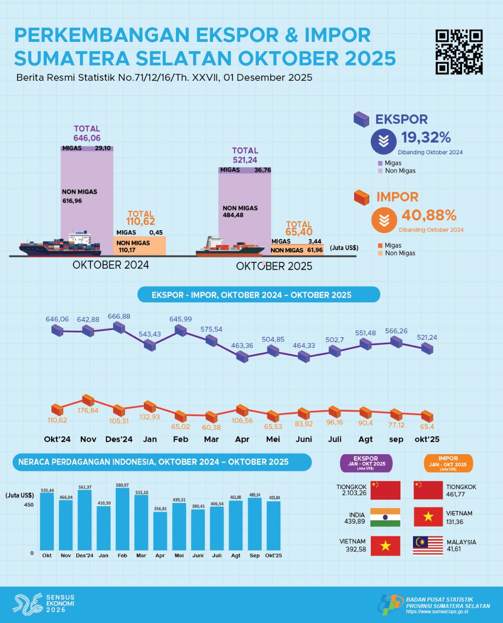 Perkembangan Ekspor dan Impor Sumatera Selatan, Oktober 2025